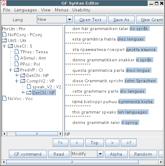 A way to test and view the resource grammar is to load langs.gfcm either into gfeditor or into the gf shell and perform actions such as syntax editing and treebank generation. For instance, the command