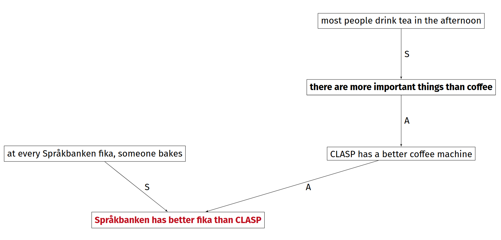 Språkbanken has better fika than CLASP: every fika, someone bakes. Sure, CLASP has a better coffee machine. On the other hand, there are more important things than coffee. In fact, most people drink tea in the afternoon.